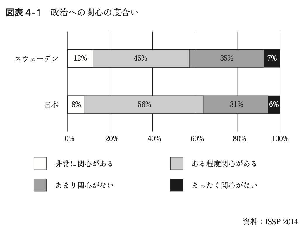「あなたは政治にどのくらい関心を持っていますか」というに質問に、「非常に関心がある」または「ある程度関心がある」と答えた人は日本で64%、スウェーデンで57%。