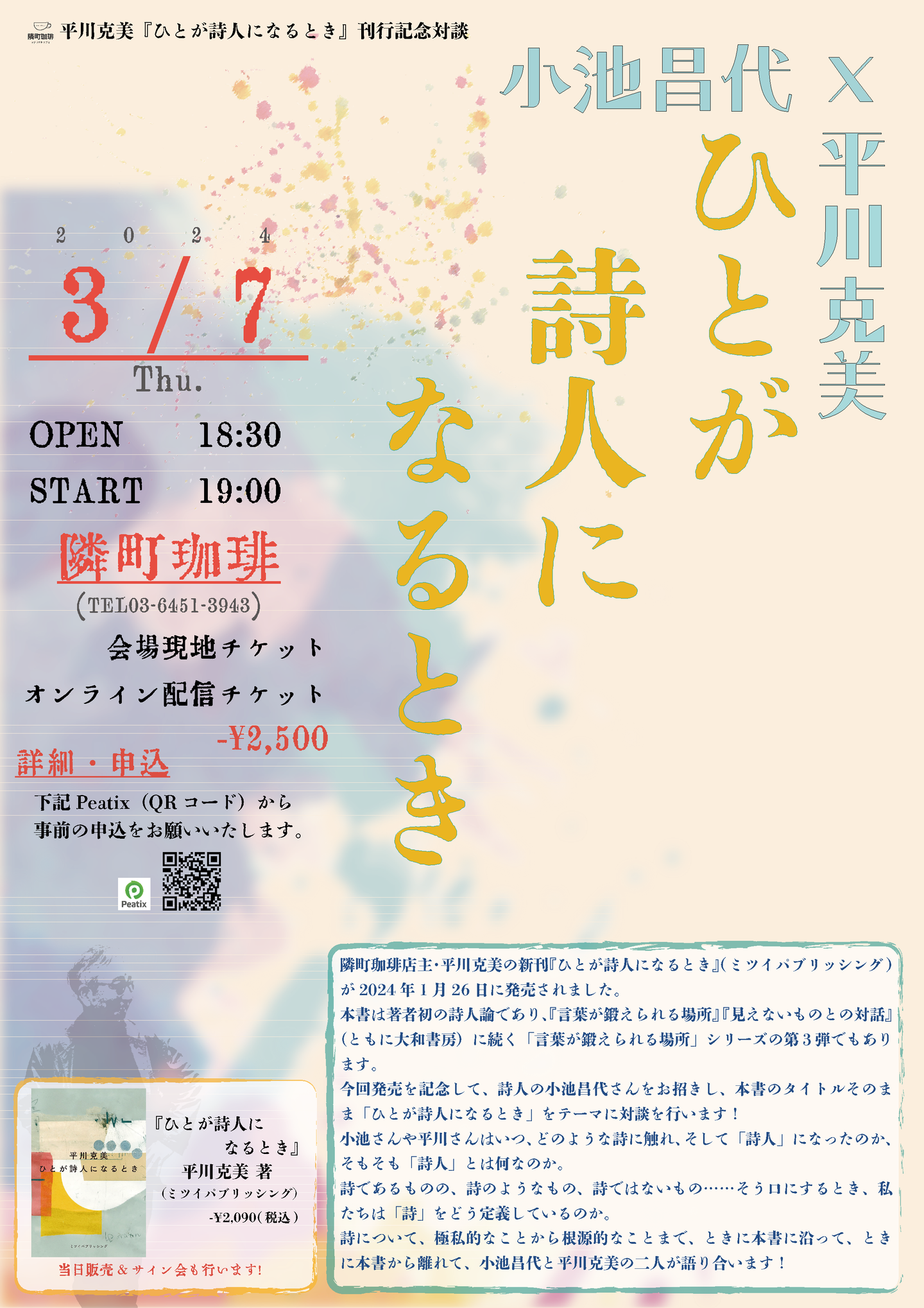 ※当日は平川克美新刊『ひとが詩人になるとき』(ミツイパブリッシング)を始め、小池昌代さん、平川克美さんの著作の販売&サイン会も行います。