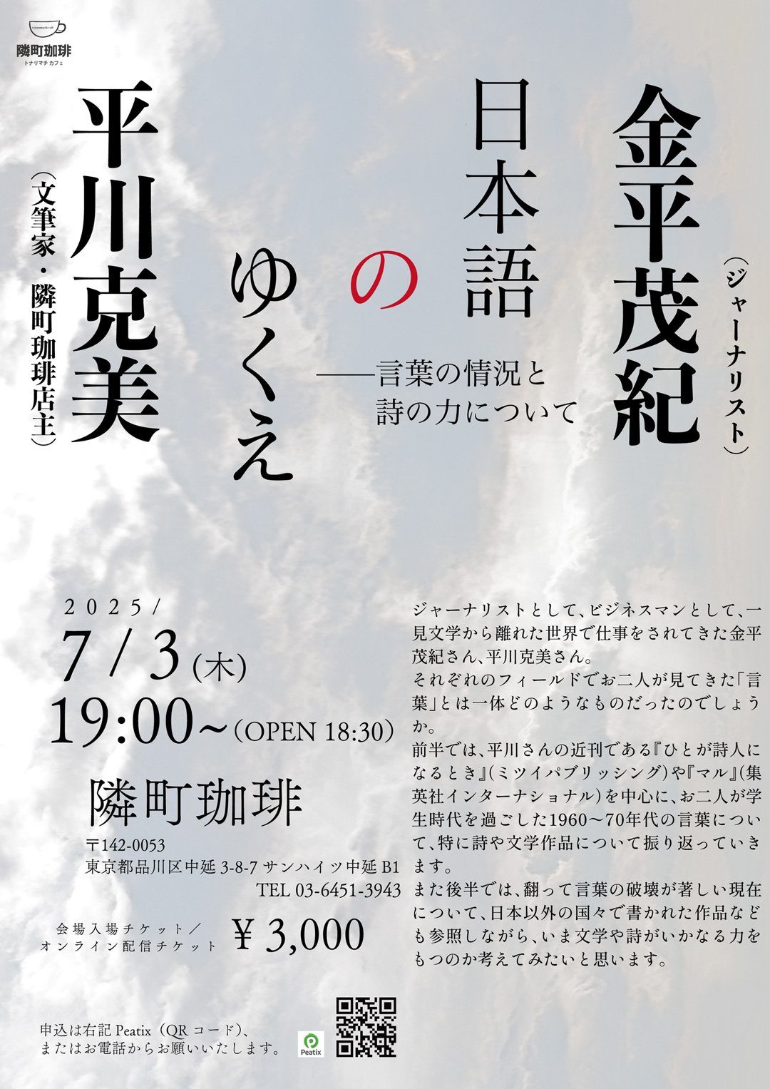【7月3日(木)】 金平茂紀×平川克美日本語のゆくえーー言葉の情況と詩の力について @隣町珈琲