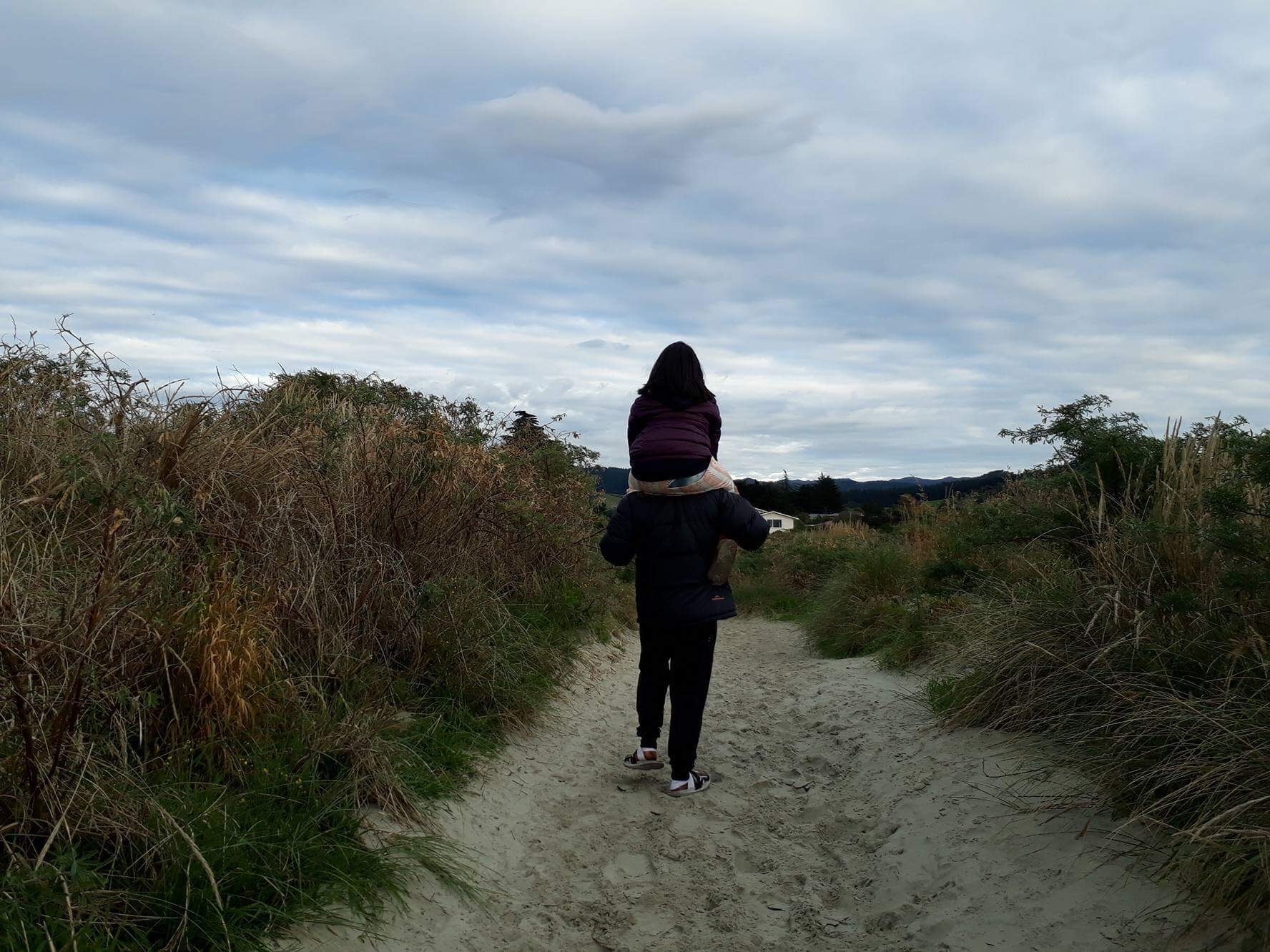 目的地に着いたら、テントを張る前に、みんなでビーチに行くことにした。駐車場からビーチまで、歩いて十分ちょっとあった。友達が交互でおんぶしてくれて、車椅子ももーちゃんが押してくれて、辿り着いた。