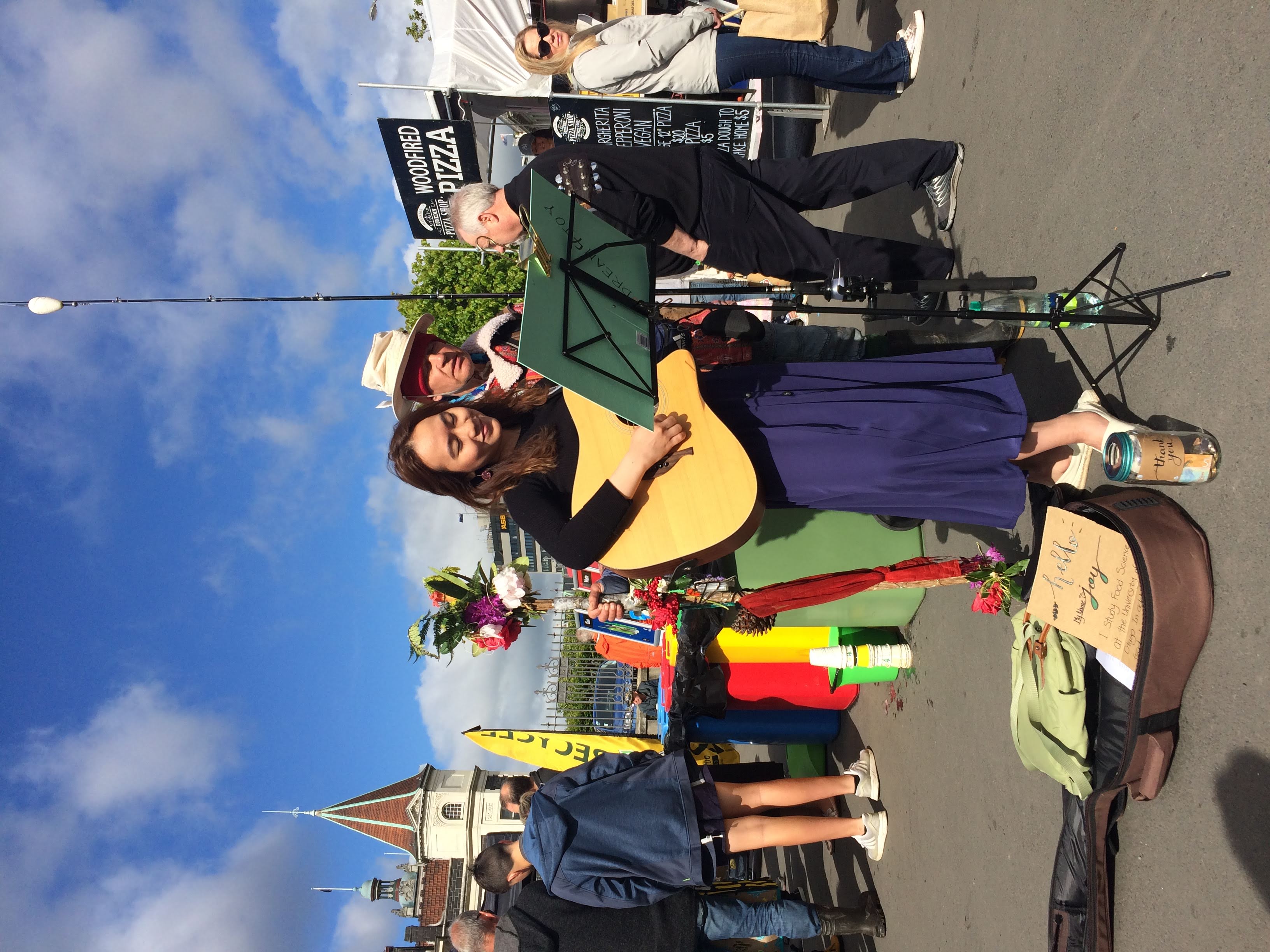 出店されるお店は、毎週大体決まっていて、八百屋さんが六件ほど、パン屋さんが二件、コーヒー屋さんが二件、お肉屋さんが二件、お魚屋さんが一件、卵屋さんが一件、お花屋さんが一件、お菓子屋さんが二件、それに加えて、クレープや、レバノンのお惣菜、釜焼きのピザ屋さんとお豆腐屋さんまである。八百屋さんは減農薬かオーガニックの農家さんだ。お菓子屋さんやお惣菜屋さんも、ビーガンやグルテンフリーなど、どんな人も楽しめるように工夫してくれている。マーケットの右と左二箇所には、街のアーティストが思い思いの音楽を演奏して、マーケットを活気づけてくれている。